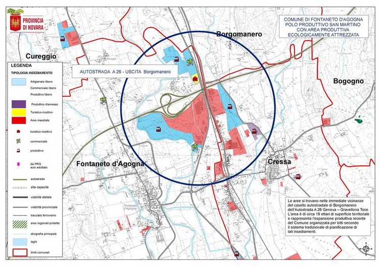 FONTANETO D’AGOGNAPRODUCTIVE POLE OF SAN MARTINO WITH A PRODUCTIVE AREA ECOLOGICALLY EQUIPPEDThis concerns a “productive pole” localized north east of council territory placed in the vicinity of the motorway exit at Borgomanero on the A26 Genoa-Gravellona Toce. This area is of about 19 hectares and represents the Council’s productive expansion. It has been organized into lots according to the traditional town planning system of such installments. The Council’s analysis of the actual situation underlines how the level of profit in the various productive sectors, whether farms, artisan or industry is of a good level and plays an important role in the local economy. The need to individuate further productive areas with zonal continuity and structural integration in this locality has, therefore, been considered, so as to satisfy the increase of internal and external demand, and, according to the analysis data, foresee the right type of firms, activities and workforce depending on local requirements collected in the survey[1]. Apart from the consolidated areas, a new area has been individuated under the “Planning Agreement” sealed on the 16/3/2010 by the Province of Novara and the Council of Fontaneto d’Agogna and put into practice by The Provincial Territorial Plan. The area, situated north of the motorway exit belonging to the St. Martino nucleus in the proximity of the already predicted tourist-commercial area, will become the Productive Area Ecologically Equipped (APEA St. Martino North) and will be able to unite economic and social needs to environmental features, and characteristics of the urban project to a complex of integrated services, so as to offer businesses the possibility to re-locate or begin new installations, in these strategic areas. In view of rationalization of access roadway systems ‘above council level’ (SP 229) and in keeping with land reduction, access to both the commercial and new productive area by means of a common roundabout has already been planned. From a quantitive point of view, the new productive installment (APEA of St. Martino) foresees a territorial surface of about 9 hectares, from which ground for vehicle parking, facilities and green areas equal to at least to 20% and land destined to roads must be put aside (the proposal contained in the General Variant predicts about 27% including the areas of intervention of environmental mitigation). From this subtraction the land surface for business installment is equal to about 6 hectares. These areas are destined for new installation of an economic-productive activity with a mixture of qualifying functions, as well as for the re-location of activities already present in the territory. The area to the extreme south-east of the productive pole, adjoining the river Agogna, will not be available briefly as it is subordinate to the realization and consequent testing of the Safety Project in that area. REFERENTIAL INFRASTRUCTURES: MOTORWAY: A 26 Genova – Gravellona Toce - Exit Borgomanero next to the area PROVINCIAL ROADS: S.P. 229 of Lake Orta - S.P. 21 – S.P. 23 – S.P.32 – S.P.122 RAILWAY: Novara / Domodossola – Cressa Station (at 1,5 km) AS FAR AS REGARDS THE TERRITORIAL REQUIREMENTS, URBANISTICS, BUILDING AND ENVIRONMENTS OF THESE PRODUCTIVE AREAS ECOLOGICALLY EQUIPPED, IT IS IMPORTANT TO UNDERLINE THAT THE ADOPTION OF TERRITORIAL, URBANISTIC AND CONSTRUCTION STANDARDS REPRESENT THE FUNDAMENTAL INSTRUMENT FOR A CORRECT AND FAVOURABLE INSTALLATION OF A TERRITORIAL APEA, AND THAT MINIMUM REQUIREMENTS IN RESPECT TO THE REGULATIONS IN FORCE ON THE SUBJECT, ARE DICTATED BY THE PLANNING AGREEMENT AND BY THE NORMS OF THE GENERAL REGULATORY PLANNING [1] Source: technical attachment of the Planning Agreement sealed the 16/3/2010 by the Province of Novara and the Town Council of Fontaneto d’Agogna.